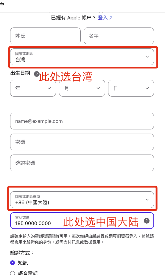 3 注意:注册新ID时地区务必选择台湾,但是电话号码选择中国大陆手机号